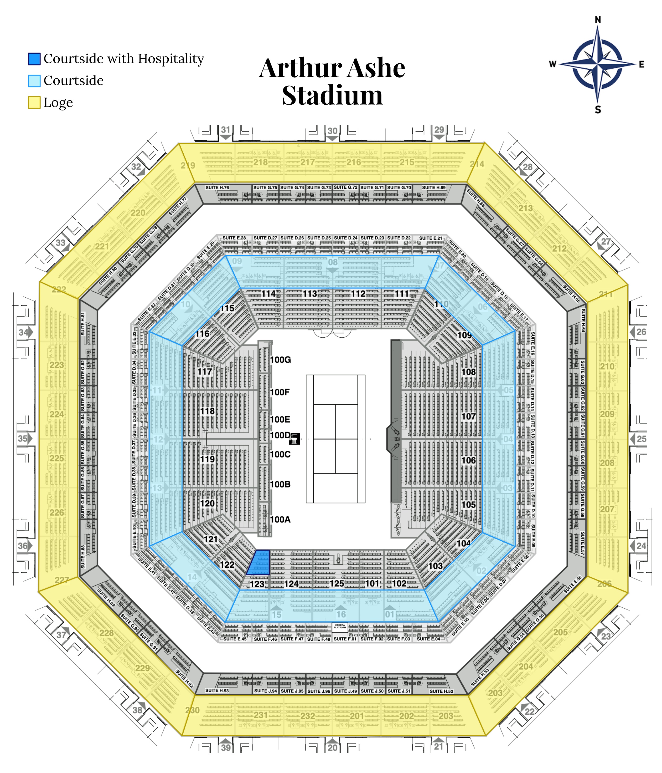 Our courtside packages on Ashe include seats within 20 rows of the court—so you'll be rubbing elbows with the stars. If you opt for loge, you'll be seated in the first eight rows of the section above the suites. On Louis Armstrong Stadium, our seats are all courtside and within eight rows of the court.
